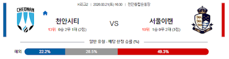 | 승/패 | 천안 패 (서울 이랜드 승) | ⭐⭐⭐⭐ | [강추] 서울 이랜드의 공격 다변화 및 천안의 수비 불안 요소 반영 |
