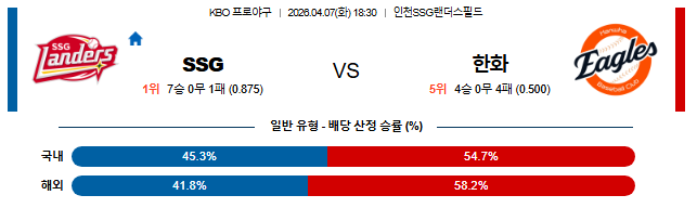 | KBO | SSG vs 한화 | 한화 승 | 류현진 효과: ERA 1.80의 류현진과 ERA 9.64의 타케다의 대결입니다. 선발 체급 차이가 너무 큽니다. |