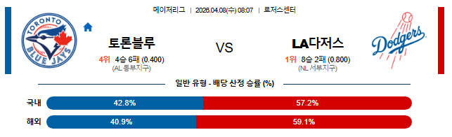 ⚾ [4/8 08:07 MLB 분석] 토론토 vs LA 다저스: '5연패' 토론토, 야마모토를 넘을 수 있을까?